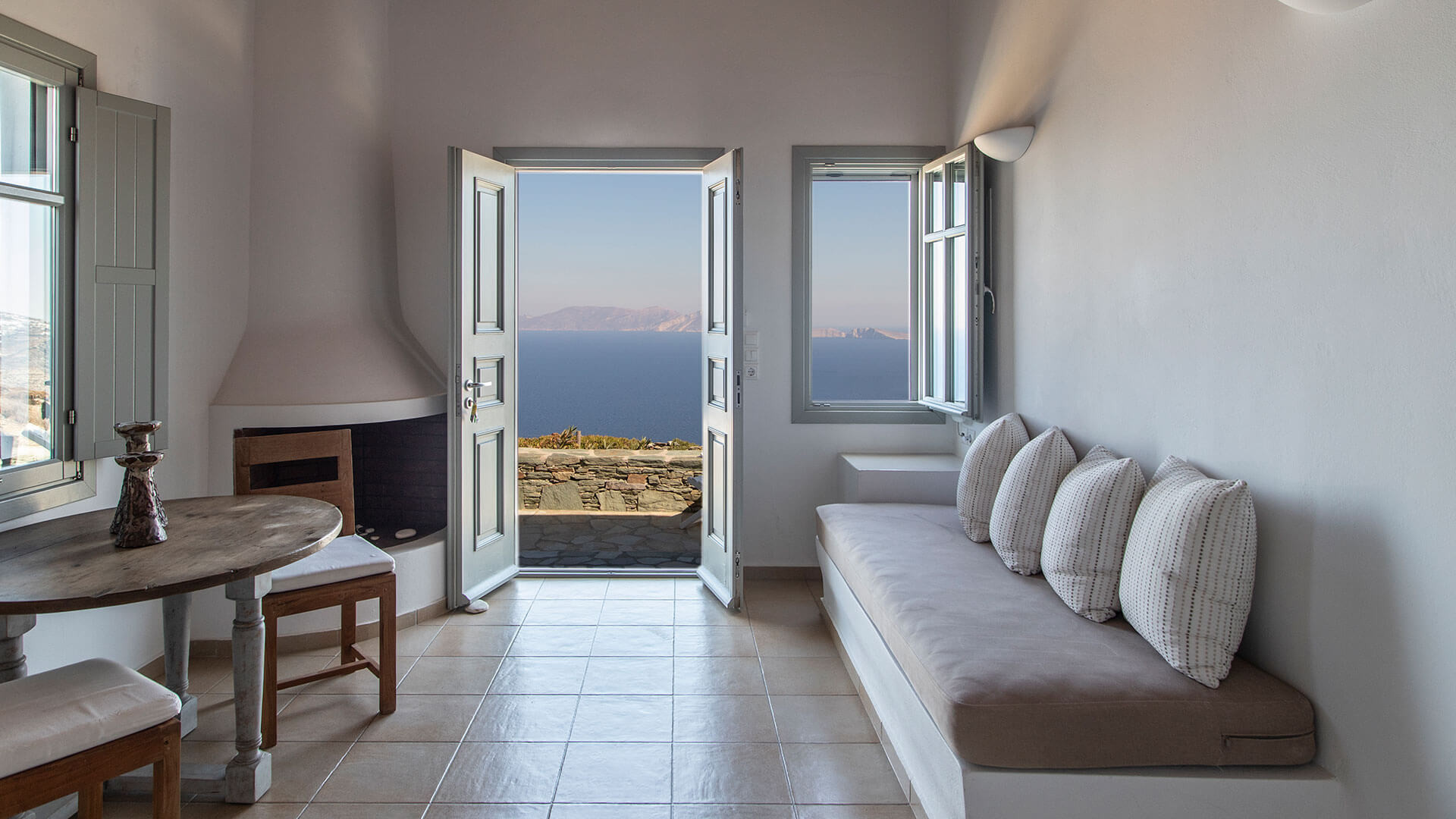 With the dramatic cliffs and calm waters of the Aegean as a backdrop, this large open-plan suite is in constant communication with the natural beauty that surrounds it.